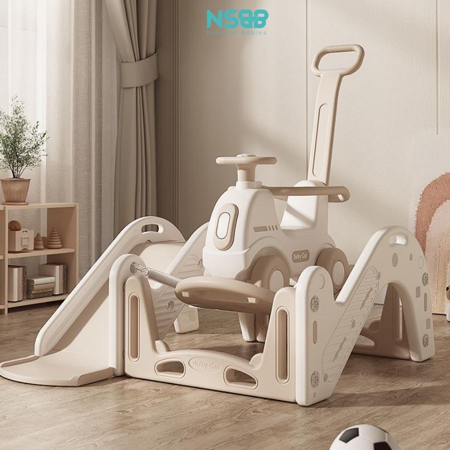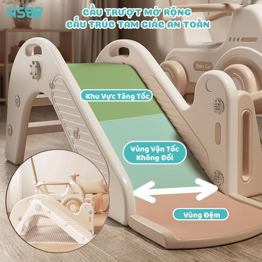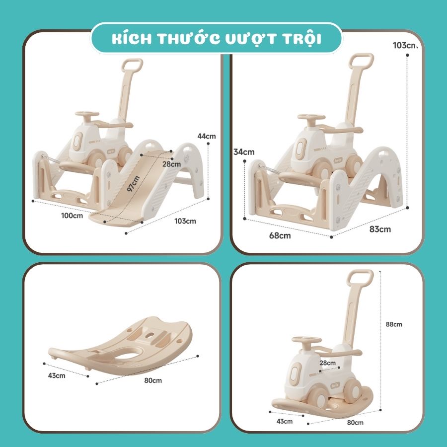 - Cầu trượt có chân trụ nối liền với xe thú nhún, không bị xê dịch, nghiêng đổ hay rung lắc khi bé chơi đùa.