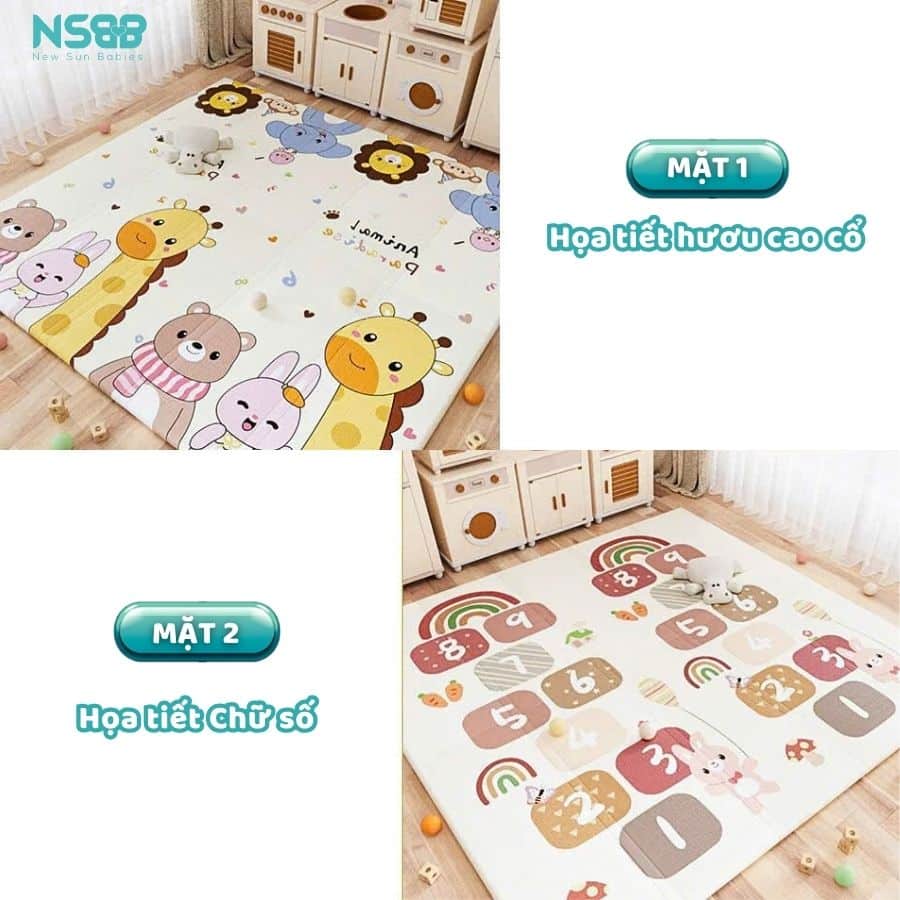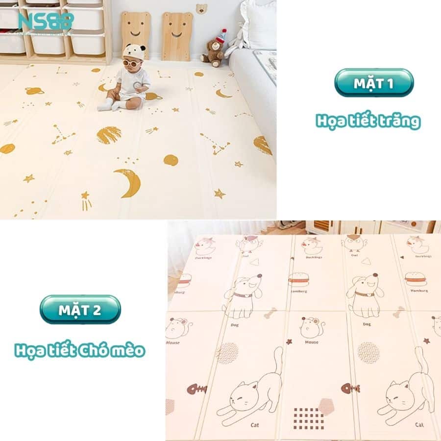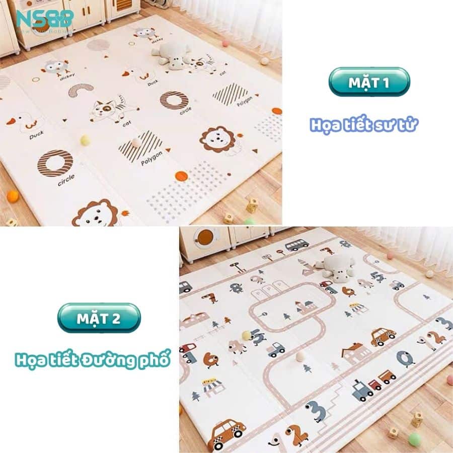 - In 2 mặt linh hoạt mỗi mặt là một họa tiết khác nhau, mang đến sự thay đổi không gian vui chơi đầy mới mẻ cho bé. Công nghệ in cao cấp đảm bảo bền màu, không chứa mực độc hại, an toàn tuyệt đối khi bé tiếp xúc trực tiếp.