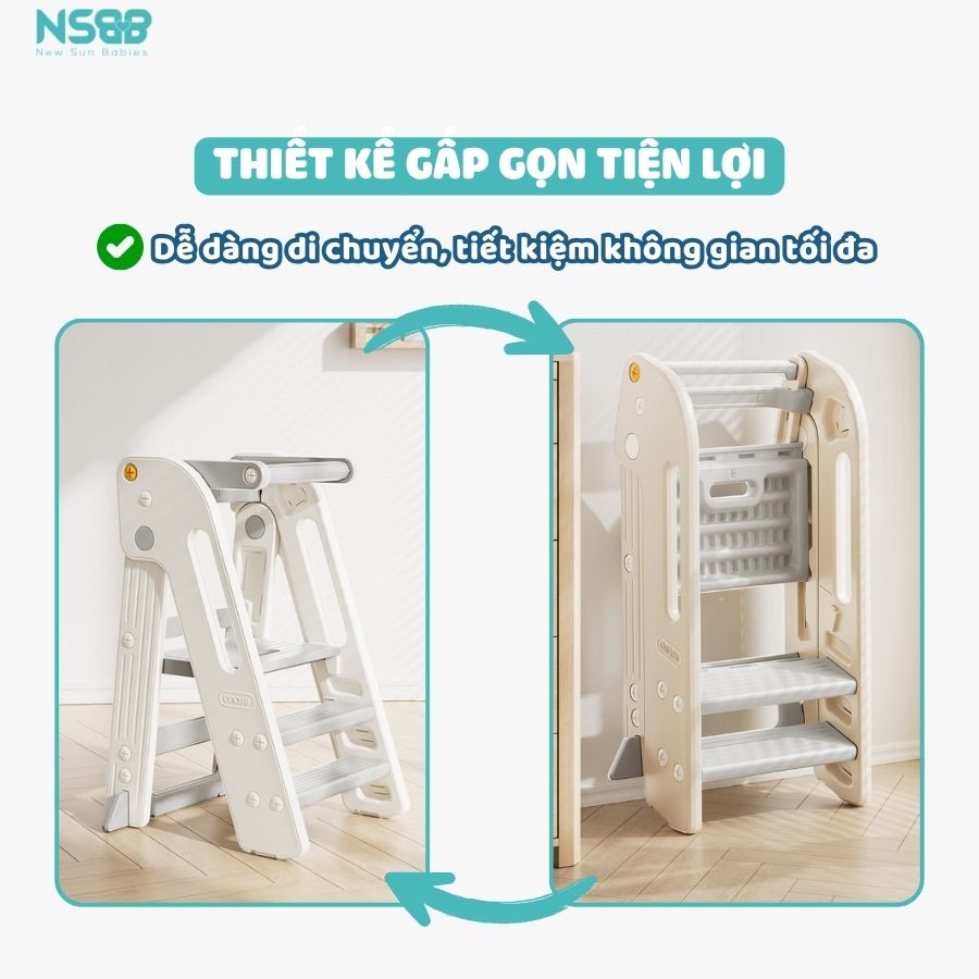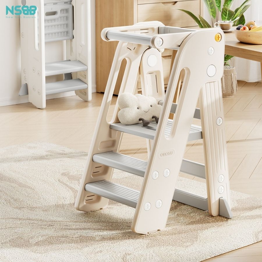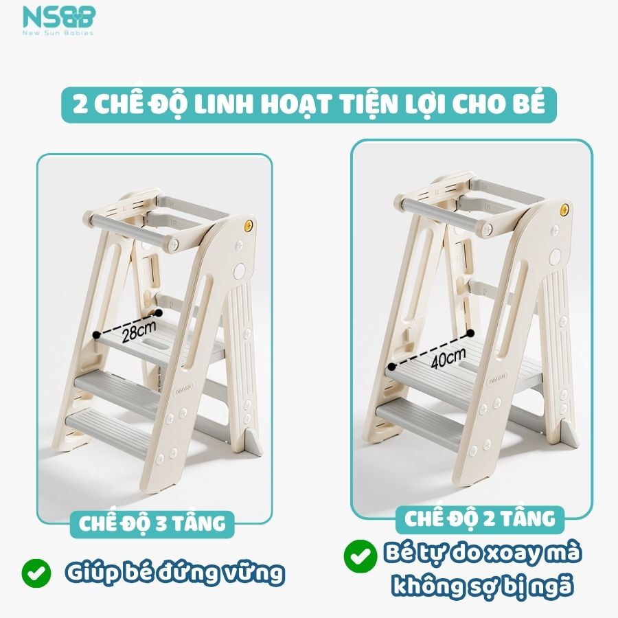 - Hai chế độ sử dụng tiện ích: Cế độ 3 tầng bậc nhất rộng 28cm giúp bé đứng vững khi rửa tay đánh răng hay lấy đồ trên cao. Chế độ 2 tầng khi hạ bậc thứ 3, tầng 2 rộng đến 40cm, cho bé thoải mái xoay người, tham gia nấu ăn cùng ba mẹ hoặc chơi đùa an toàn mà không lo mất thăng bằng.