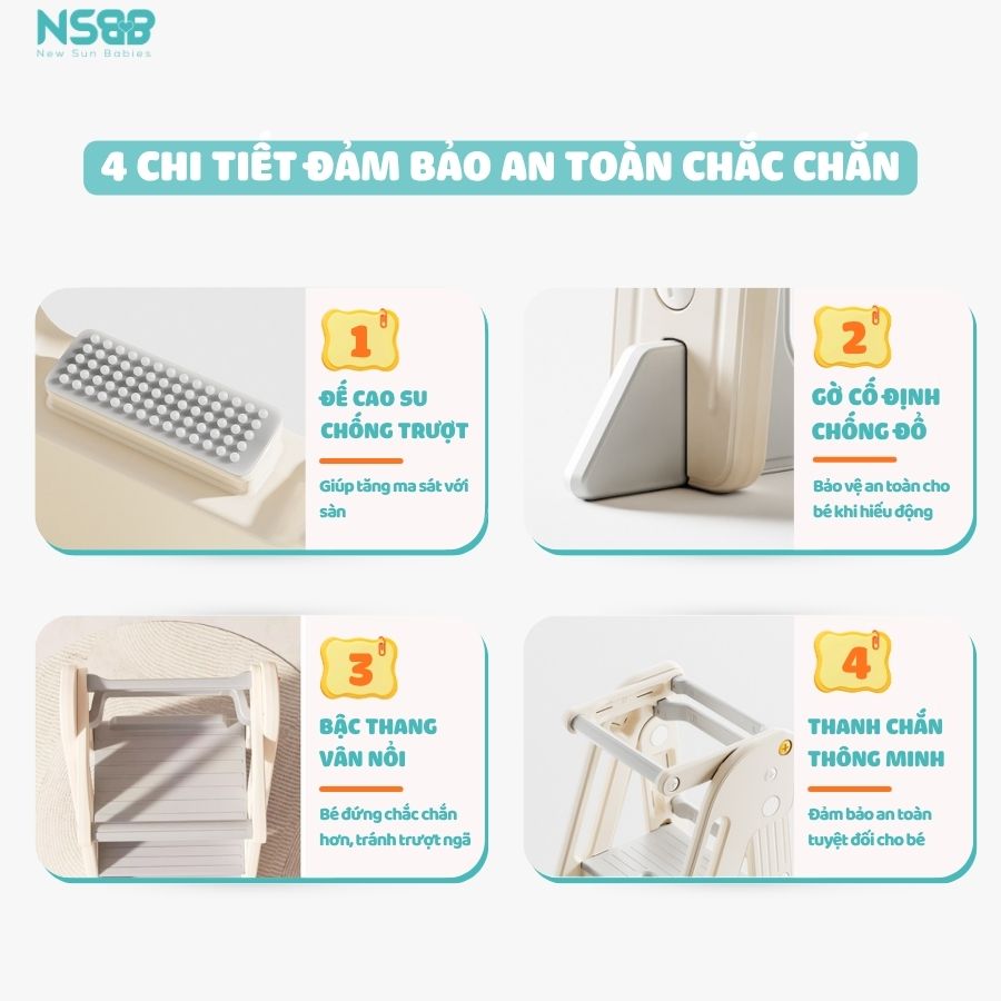 - Bậc thang vân nổi chống trơn: Giúp bé di chuyển an toàn hơn, tránh trượt ngã khi rửa tay, đánh răng hay tham gia các hoạt động khác.