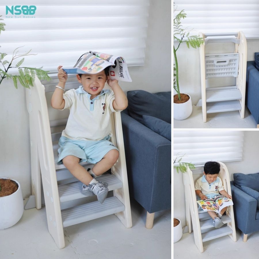 - Kết cấu tam giác ổn định: Trọng tâm được phân bổ khoa học, giúp thang vững chắc và hạn chế lật nghiêng khi bé leo, đứng hoặc di chuyển.