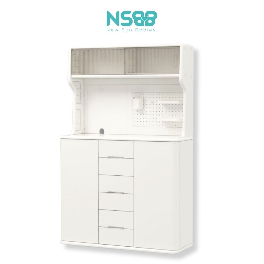 - Sở hữu thiết kế tối giản nhưng đầy tinh tế, kệ tủ E012 gây ấn tượng với gam màu trắng thanh lịch, kết hợp cửa trượt màu trà sang trọng vừa là nội thất trang trí, vừa là trợ thủ đắc lực trong việc chăm sóc bé.